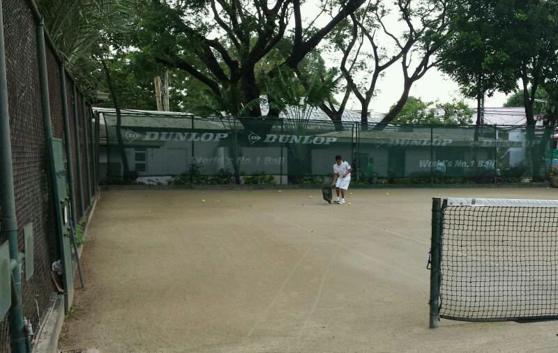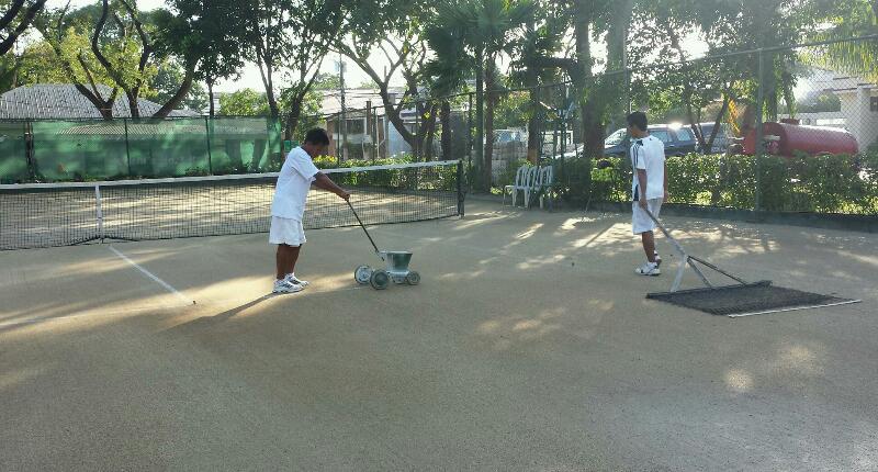 Ball boys are maintaining the shell tennis court by marking lines using chalk and leveling the crushed shells using net mop