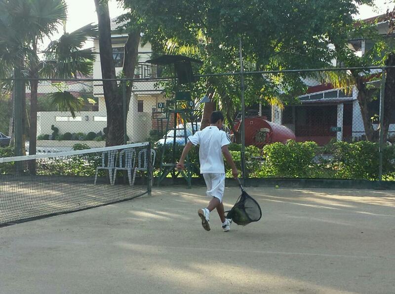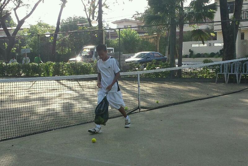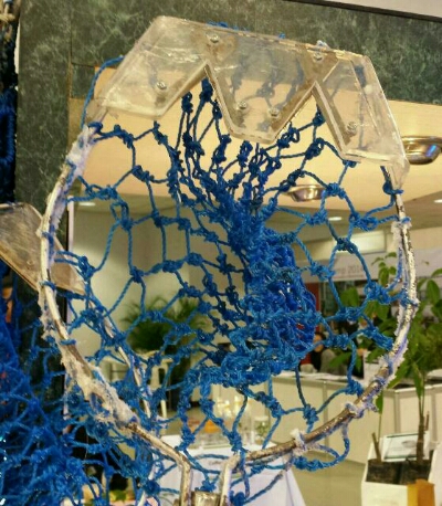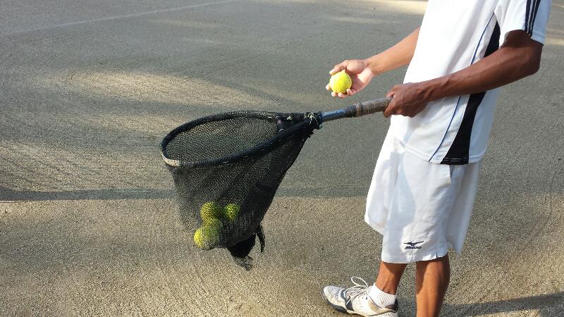 Old tennis racket repurposed into pulot boy’s ball snatcher by fusing some netting around the racket’s rim