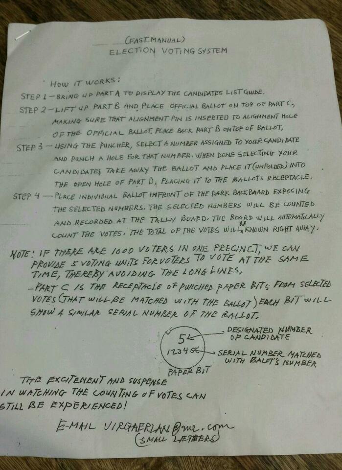 Well, this election voting system on paper says no electricity needed. Voting will be fast for instead of writing, one just needs to punch holes. Reminds me of the beginnings of computing systems where punched cards were used.  Also reminds me of the paper bus tickets in the country.  An entertaining read.