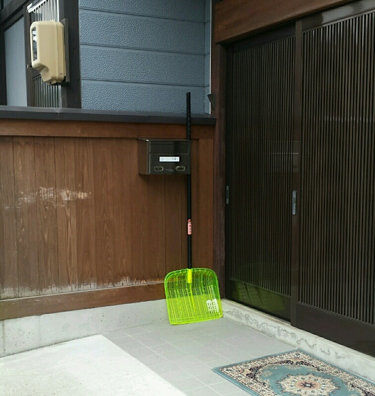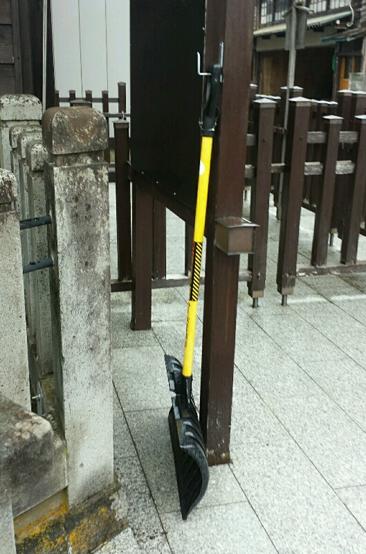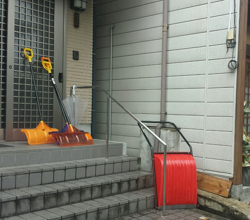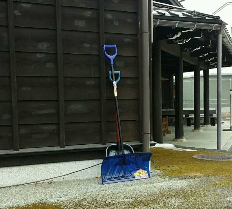 At past the peak of winter snowing in Hida Region around March, one can notice plainly the handy snow shovels in different shapes, sizes, and colors, in front of homes, shops, and shrines, in standby mode.