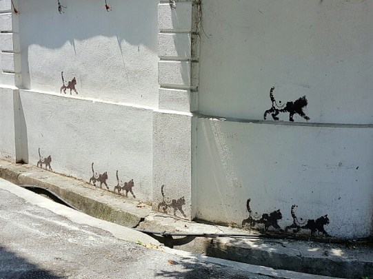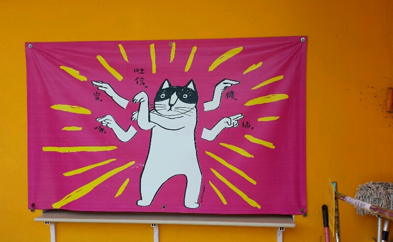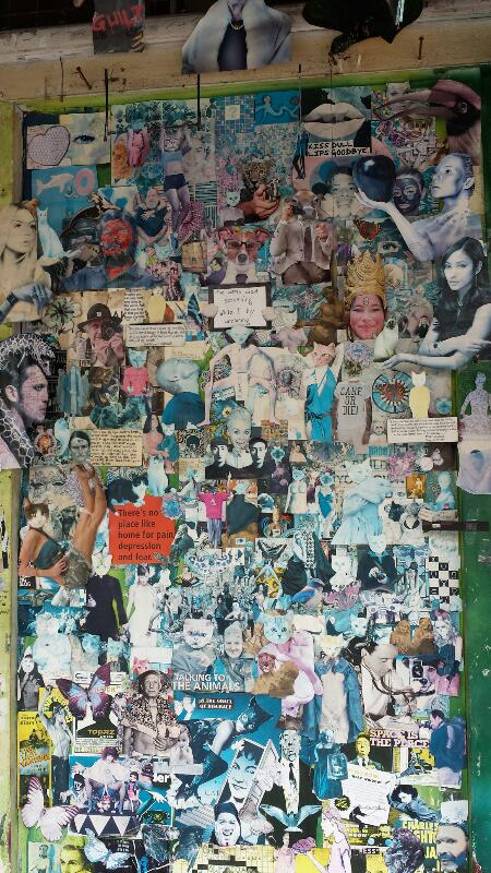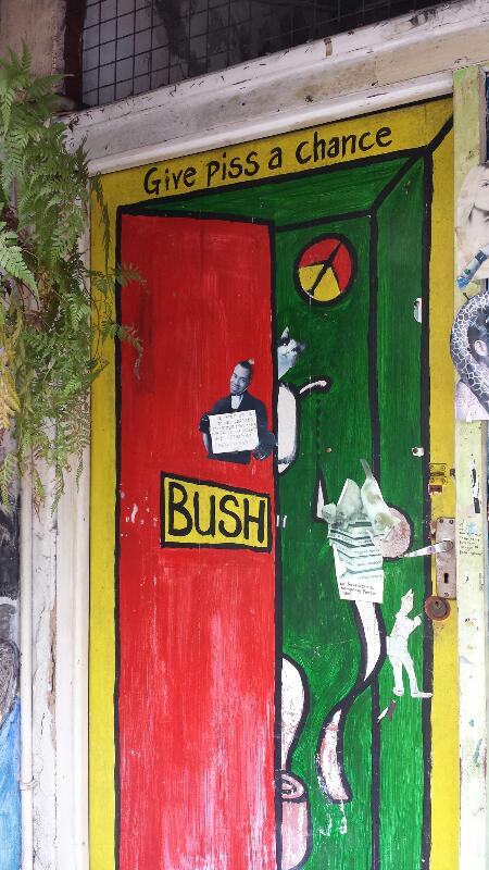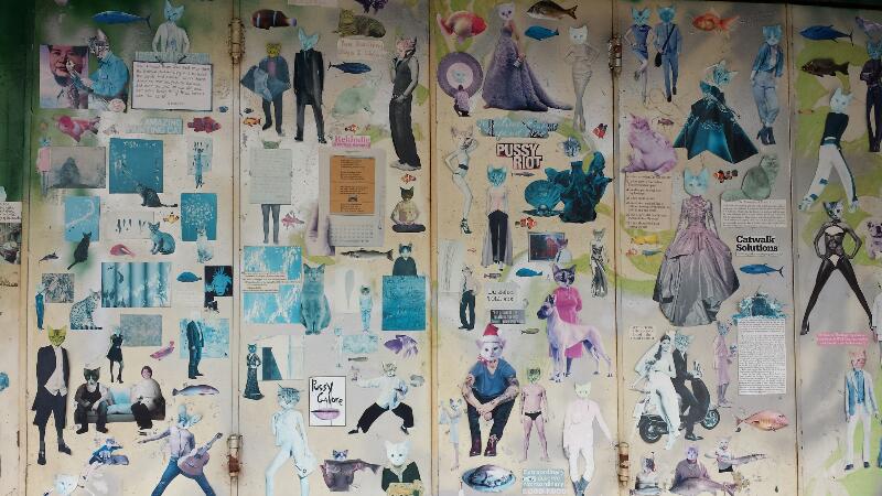 As you can see, almost entirely, those are cat head cutouts pasted over human bodies, and put together as collage on a wall by some fine arts dude, a cat fellow or somebody with a twisted mind. Adjacent to that collage wall is a door with “Give piss a chance” written on it.