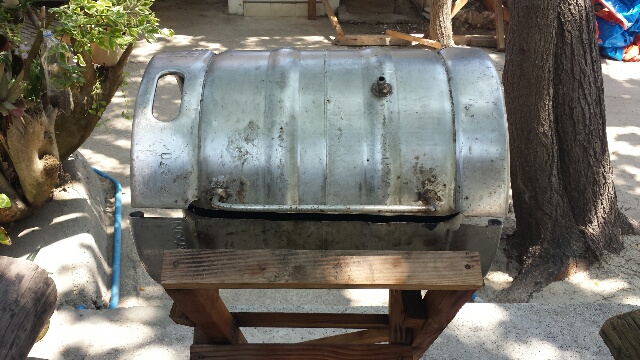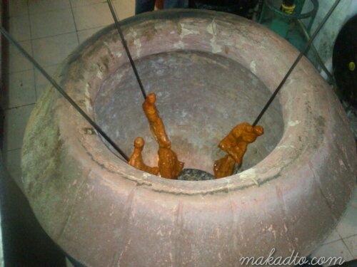 In this barrel shaped clay oven, skewered seasoned chicken is being roasted and the end product is known as chicken tandoori