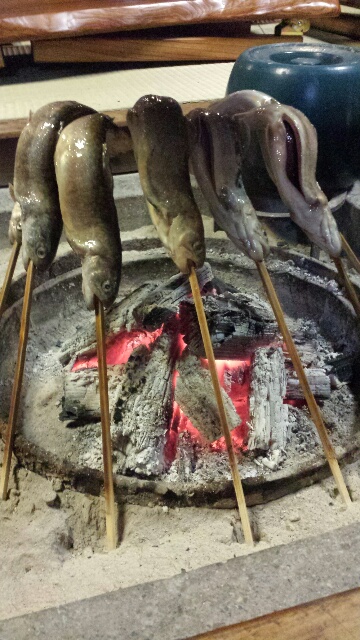 Trout from the mountain streams are grilled with salt in skewers over live charcoals in an almost standing position. It’s a local fare in Ainokura, a remote but very lovely mountain village in Gokayama region.