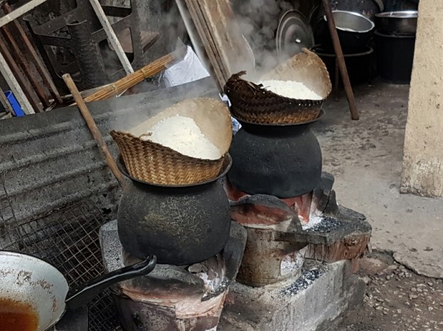 Steaming sticky rice in a bamboo basket that sits on an aluminum pot with water