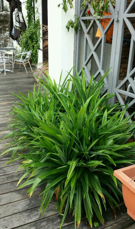I wonder if the human being behind that potted pandan uses it for purposes other than green ornamentation.