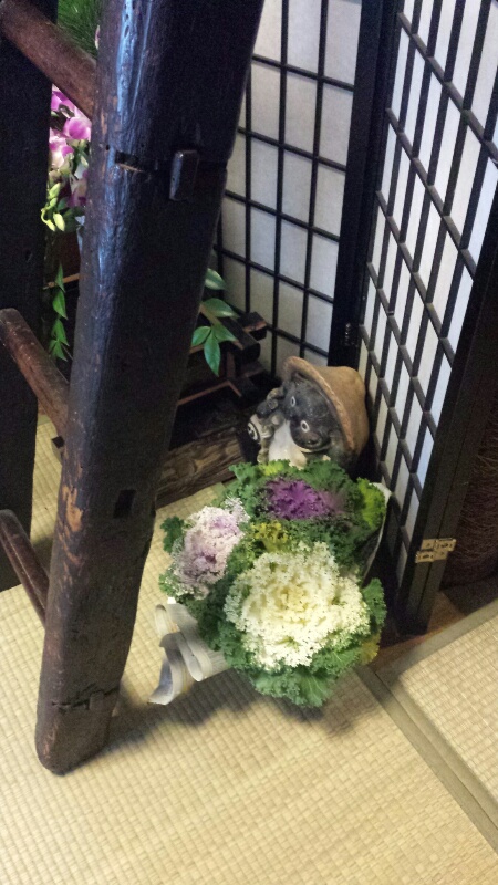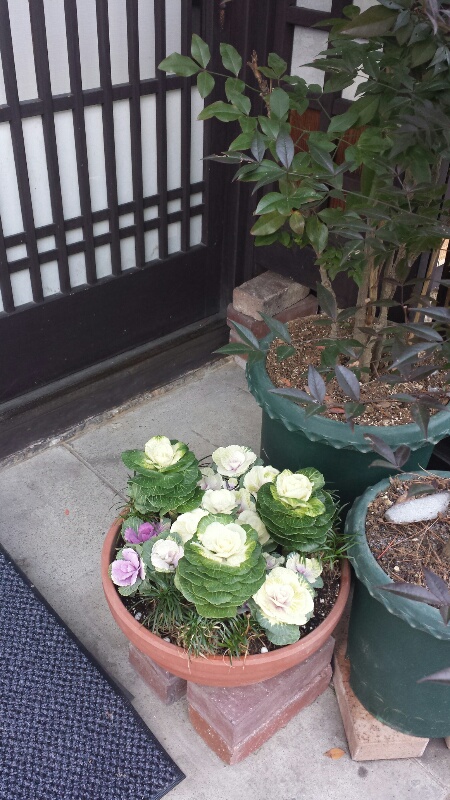 I have noted the presence of potted kale in various places in Japan this winter. From what I gather this vegetable is frost resistant and that is why it is pretty common at winter time though not for eating but for the beautification of their doorsteps.