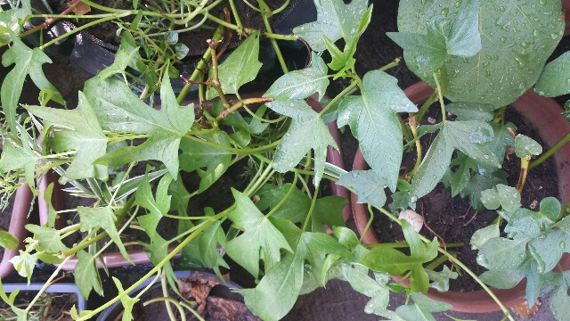 Somebody has decided to plant alugbati (a green leafy vegetable) on a sidewalk.