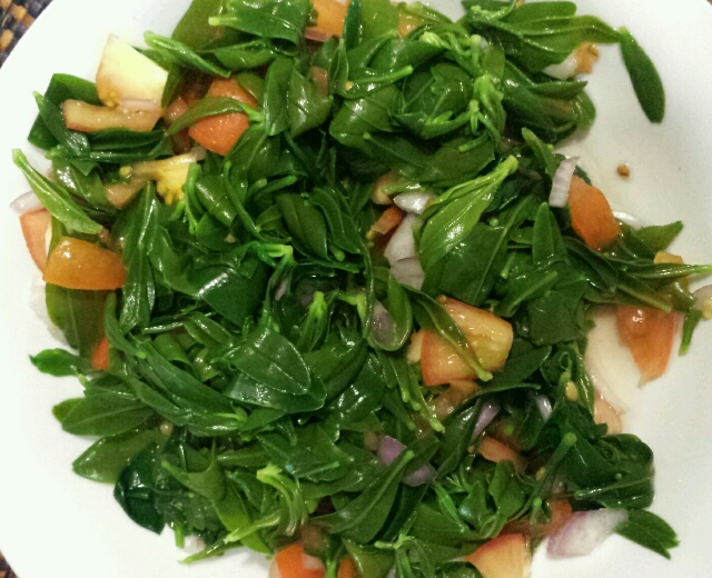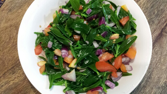 I have several plants with edible leaves from my container garden. Last night, I picked some talinum tops and made salad by adding chopped onions and tomatoes to the young leaves after blanching them. I then put a bit of sea salt as I mixed the three ingredients to come up with a deliciously nutritional salad accompaniment to my rice meal.