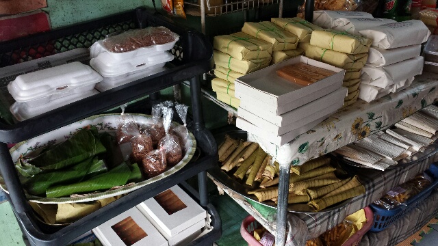 Assortment of rice cakes and the pinatuyuang hipon sa gata (inside those stypor containers at the upper left side)