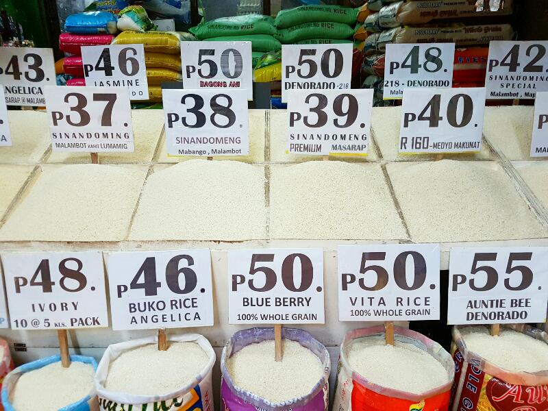 The number on the sign denote the price of rice per kilo in Philippine peso. Rice in open sacks on the first row are branded and their signs carry the brand name. Unbranded rice on the second and third rows have signs that tell the variety and quality factor like malambot (tender) and mabango (aromatic).