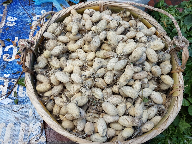 Ant eggs are a little sour and are eaten with chicken eggs, in fish soup, or just steamed for a snack.