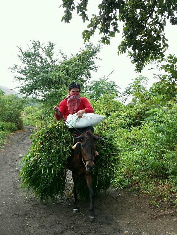 Horse carrying its keeper and its food, or maybe food for the working horses
