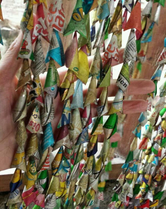 Ceiling ornamentation and curtains made from food foil bags or foil wrappers