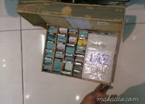 Receipt housing and barcode tag pigeonholes repurposed from taped carton as seen in Landmark Department Store.