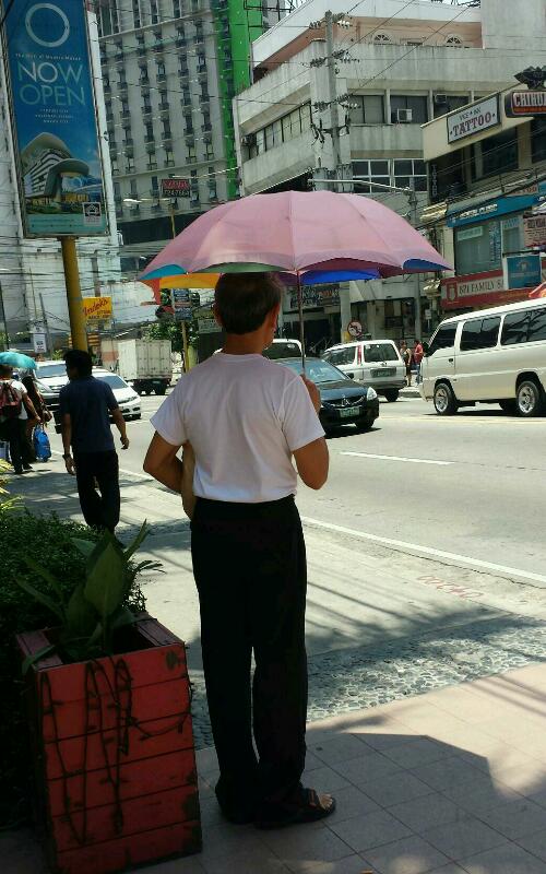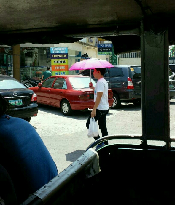 "I don't care if you doubt my masculinity, it's just too hot" - guy in pink umbrella