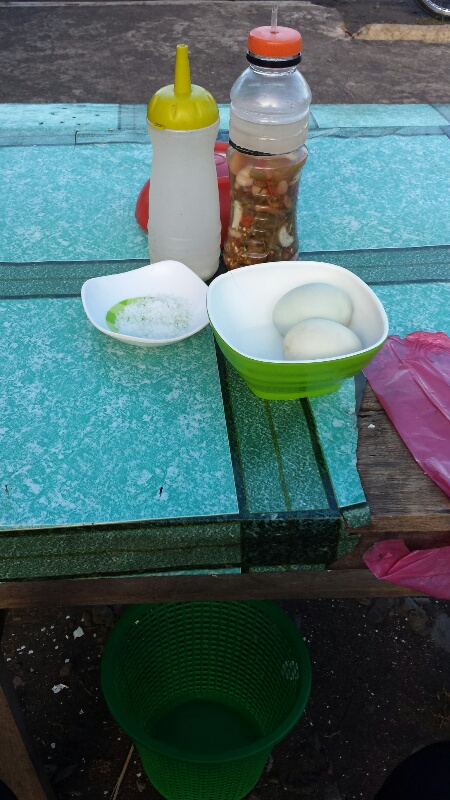 Balot snacking (spelled as balut in Manila), is a sit-down and unhurried street food indulgence in Misamis Occidental. Several small tables with chairs are available. On top of the table are the vinegar and salt condiments; under the table is a bin for egg shells and other throwaways. Indeed it’s only in Oroquieta and Ozamiz where I’ve seen an outdoor table service for balot so far.
