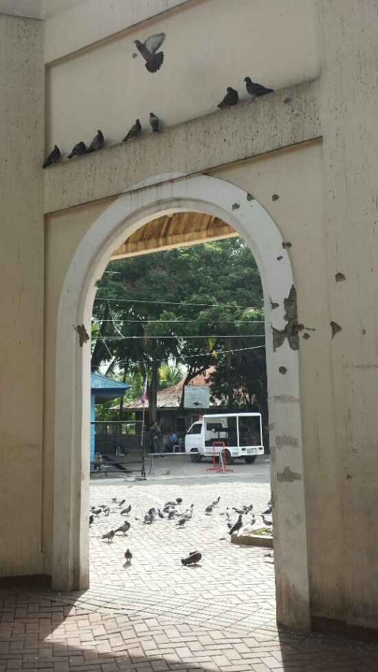 Bullet holes from the urban warfare last year and doves near Fort Pilar