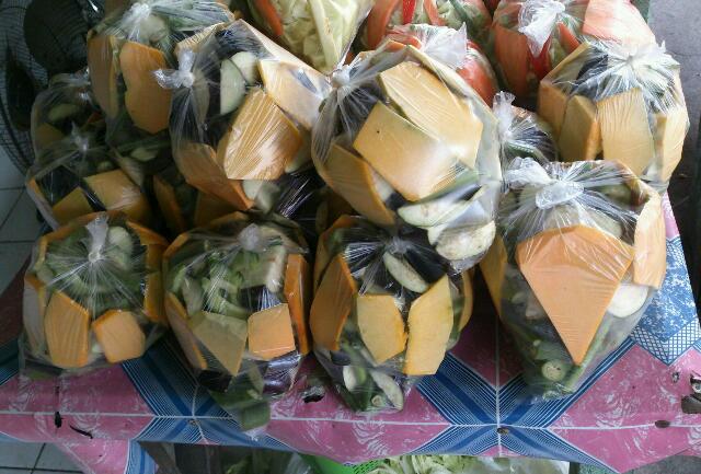 Vegetables needed for a pinakbet dish are sliced and packed for the convenience of the cook and also for the seller to dispose of those imperfect whole ones (e.g. whole eggplant) by slicing the good sections from it of which these will then be sold as members of the pinakbet packet.