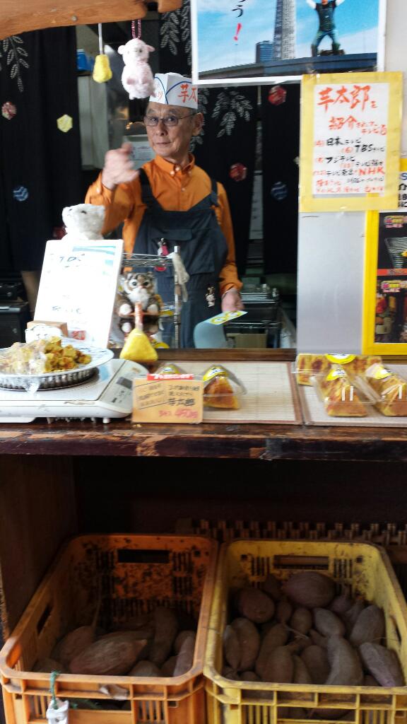 A shopkeeper in Kawagoe selling sweet potato snacks. Sweet potato is a specialty of Kawagoe, so naturally the mascot of this place is a sweet potato