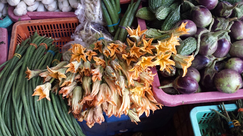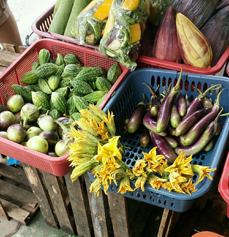 Bulaklak ng kalabasa (squash flower) is eaten as vegetable. Normally it goes with eggplant, ampalaya, and sitaw in the same dish such as pinakbet or vegetable soups (e.g. laswa, bulanglang, dinengdeng). Hence the complementary vegetables are placed beside each other on the table space at the market.
