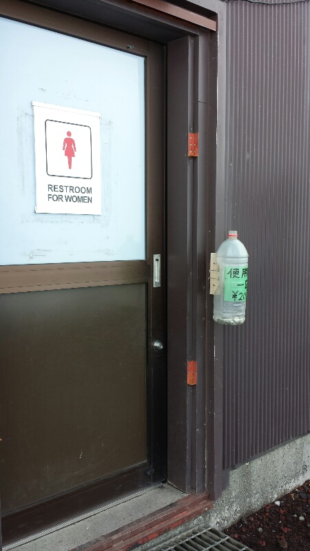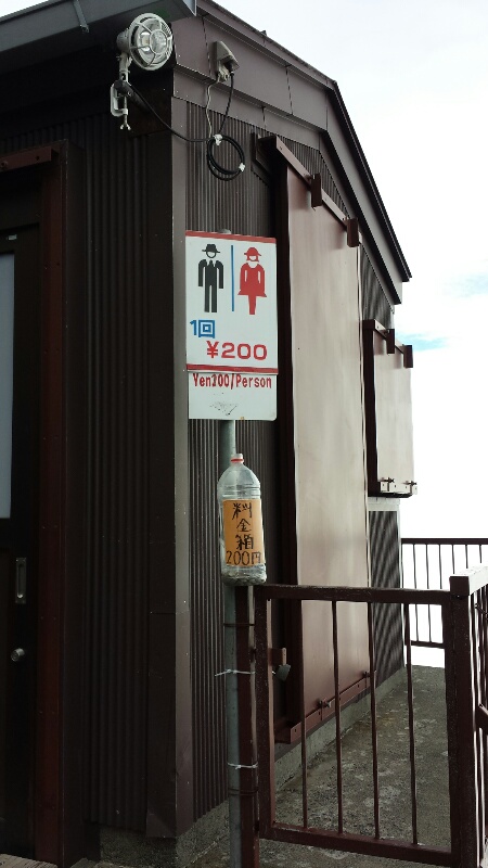 Toilets are available at the huts along the Yoshida trail of Mount Fuji where each usage is understandably expensive at 200 yen. The higher you go, the higher the ‘donation’, and so it’s 300 yen at the summit. Some toilets have high tech vending machine like repository for coins, but a couple, or three of them use repurposed plastic bottle as receptacle for dropping in at least two 100 yen coins.