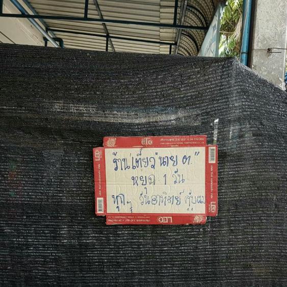 A sign made from a scrap flattened carton box that is posted on a fabric that covers the furnishings of a humble sidewalk night-time eating place. It says “Closed for 1 day” (I guess).