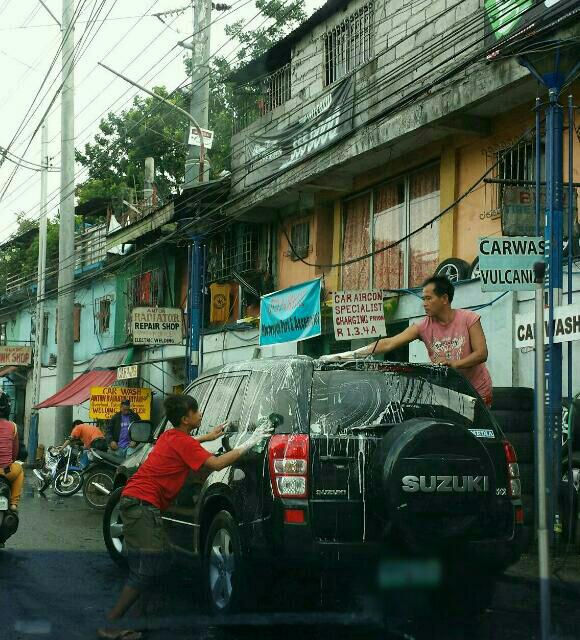 Car washing and other car services done on the road eating up a lane. Yet another typical scene