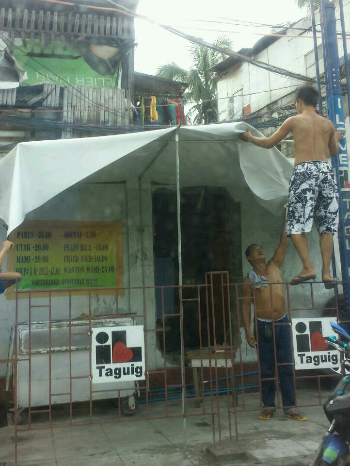Rain proofing a sidewalk carinderia by setting up tarp