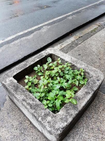 Somebody has decided to plant alugbati (a green leafy vegetable) on a sidewalk.