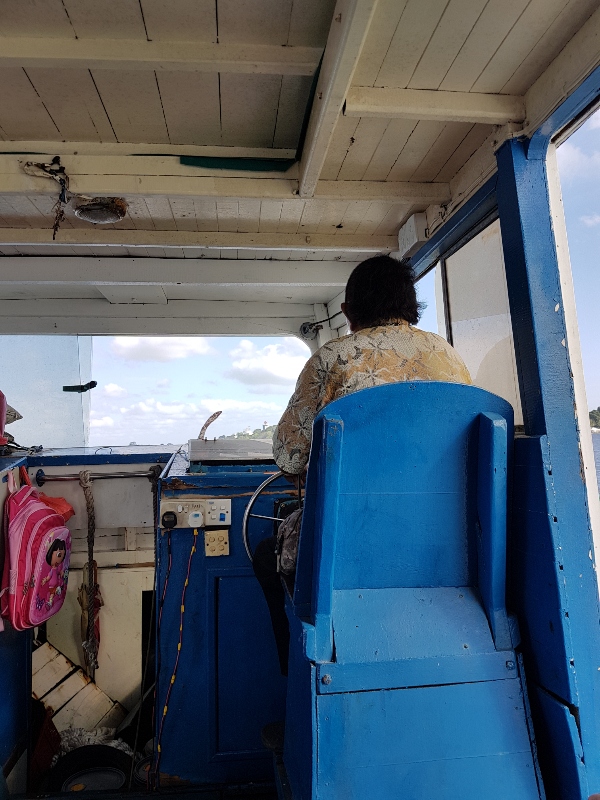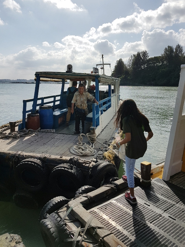 A girl about to step on the boat that is leaving Pulau Ubin for the mainland.