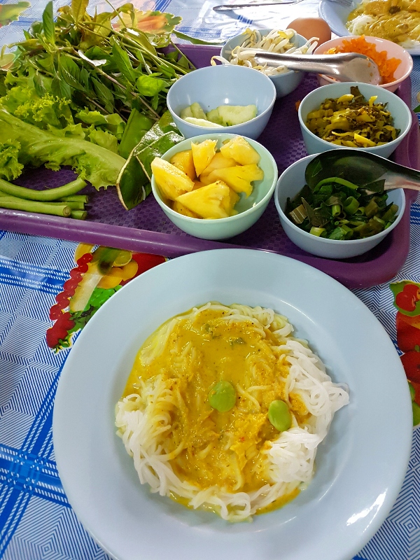 Kanom jeen (boiled rice noodles slathered with curry sauce of your choice, like spicy fish curry, with fresh and fermented vegetables as accompaniments)