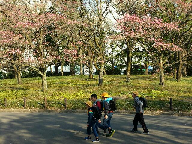 Schoolboys at Kitanomaru National Garden in black randoseru and yellow hats
