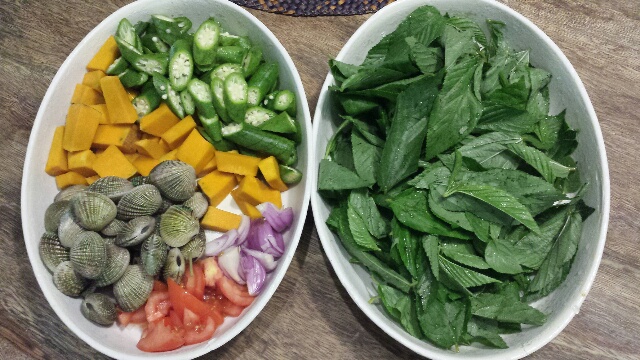 Ingredients: Onion, tomato, clams, saluyot, squash, and okra