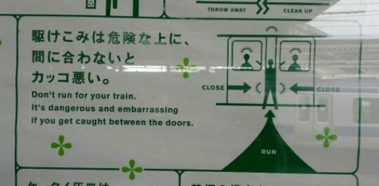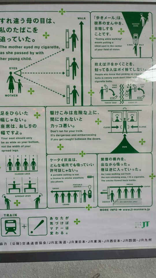 I love the illustrated signs in Japan. At Tsuchiura train station they have this manners campaign poster and this is just one example of the many illustrated signs that are seen in public places.